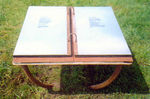 2002eikenhouten tafel met verzinkte poten en ingelegde zinken platen. Op de platen is een gedicht van Josee Algra gezeefdrukt.